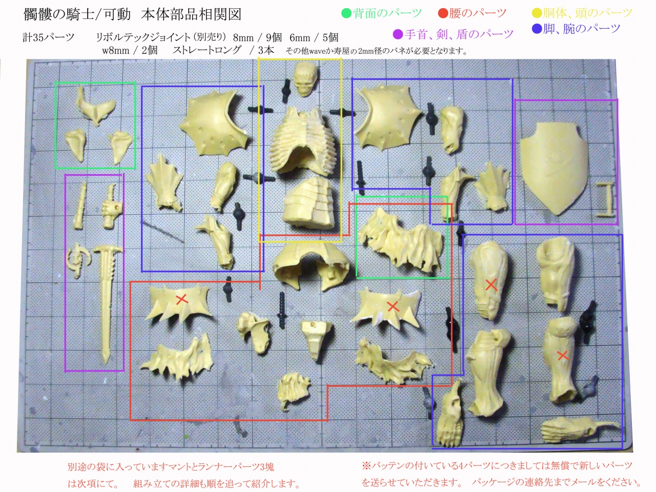 髑髏の騎士に関してですが、部品の不足リストにも書きましたが、生産に時間とられて余裕がなかったので組み立ての説明は後ほどこのサイトでやろうとおもいます。 またその後になりますがPDFでも落として画像テキストか紙に印刷していただくかたちで説明書を手にしていただく形にできればと思っています。 今しばらくお待ちください。