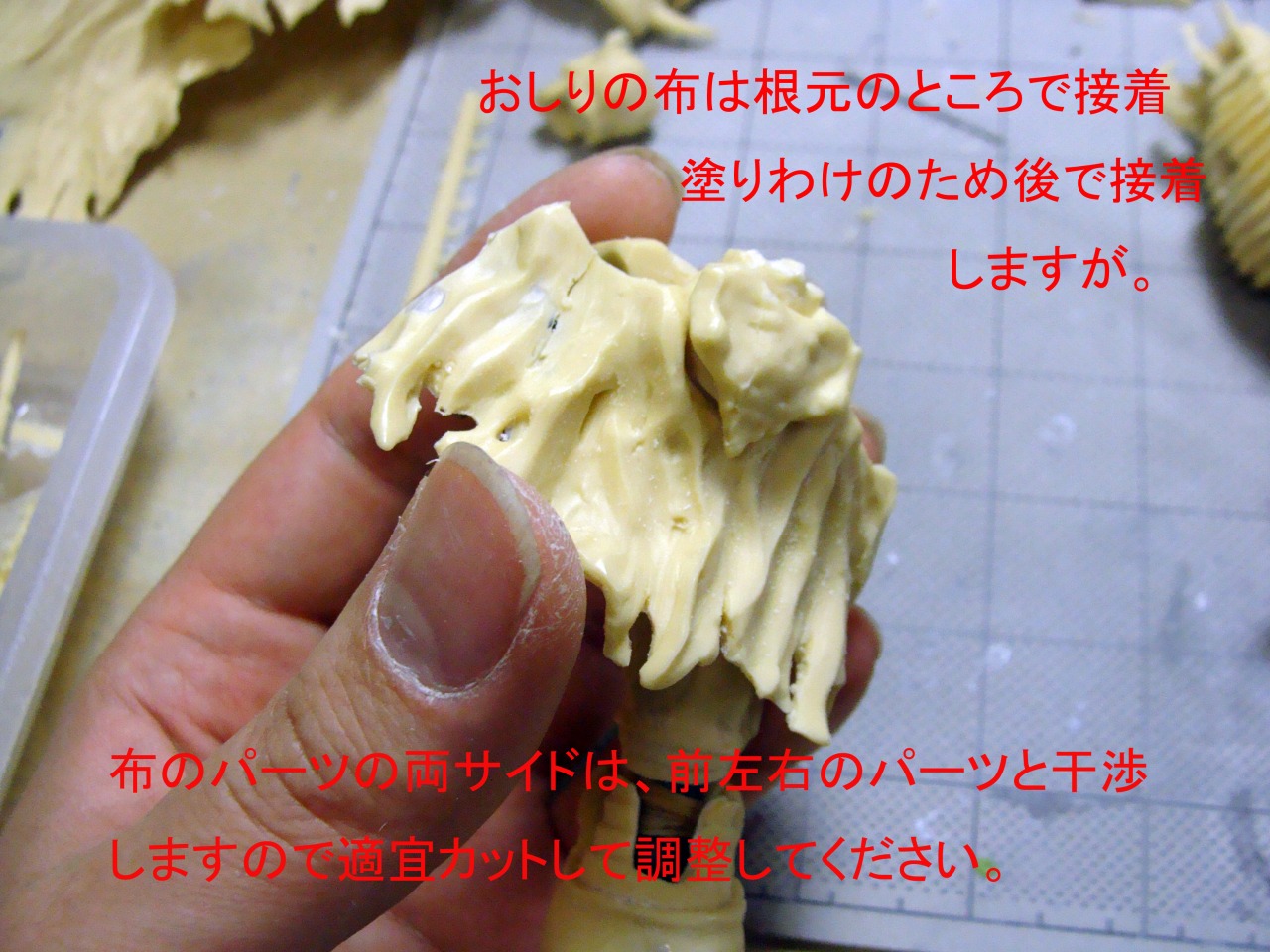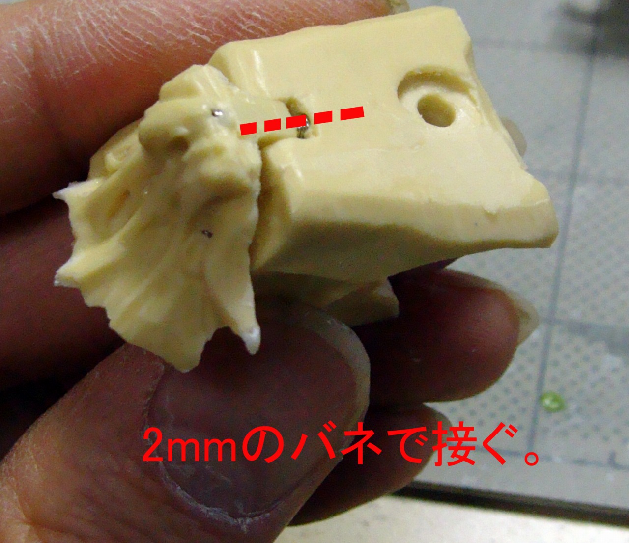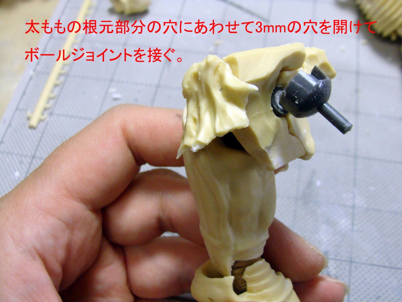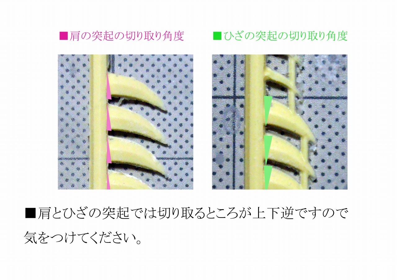 右ひざのダブルジョイントを埋めるほぞ穴が少々深すぎているようです。 ひざを曲げると抜けますのでエポパテなどで適宜調整してみてください。