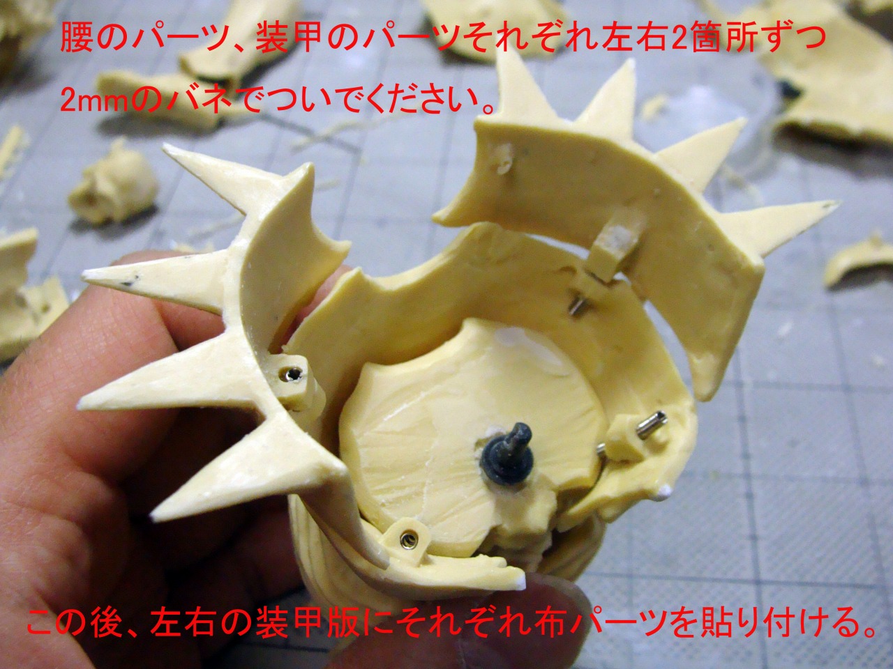 腰と装甲のパーツはそれぞれ左右各2箇所筒2mmのバネで接いでゆきます。