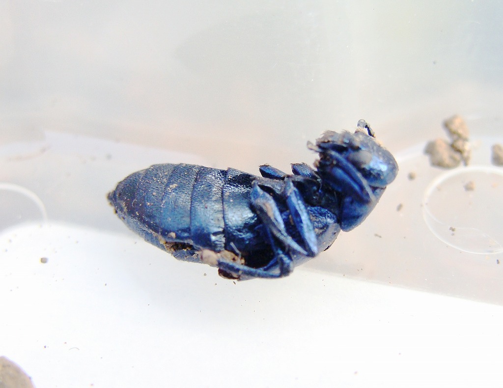 ちなみに、勘違いされている方も多いと思うのですが、この種類のスカラベは、糞の玉を転がしますが、ニジダイコクではそういうことはせずに、体を全体で団子状にしているようです。
