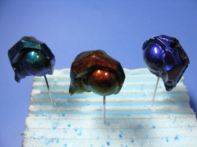 少し、色味をビビットにしてあります。 フェニッシャーズのウエスブラックを薄めに吹いて、同じくクロームシルバーで凹凸を強調して吹いてやり、良く乾いてから、ガイアカラーの原色シアン、味付け程度に原色マゼンタでしあげ。