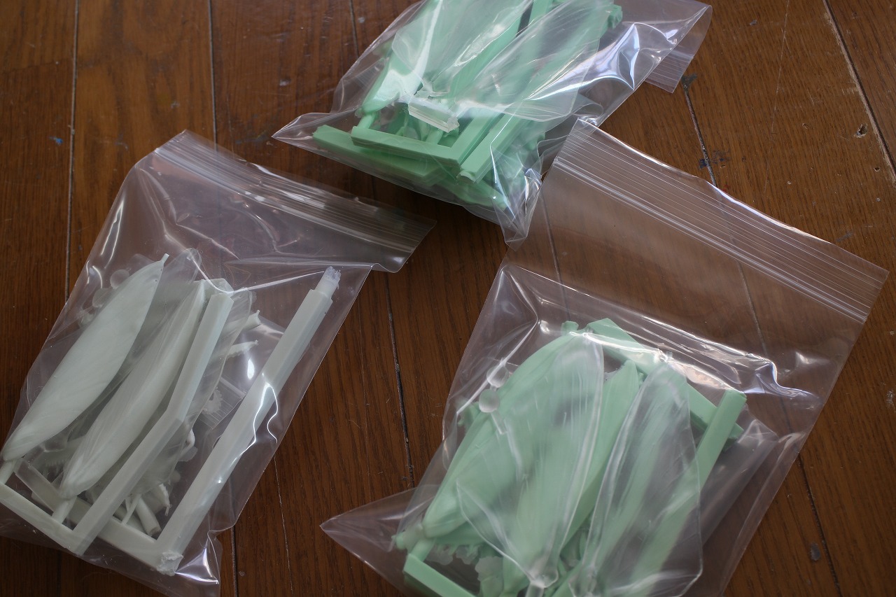 変わってカマキリの袋詰め状態。 蛍光グリーンのカラーレジンを使用していますが、顔料の比重が重いために、最初の方の色にばらつきが出てしまいました。