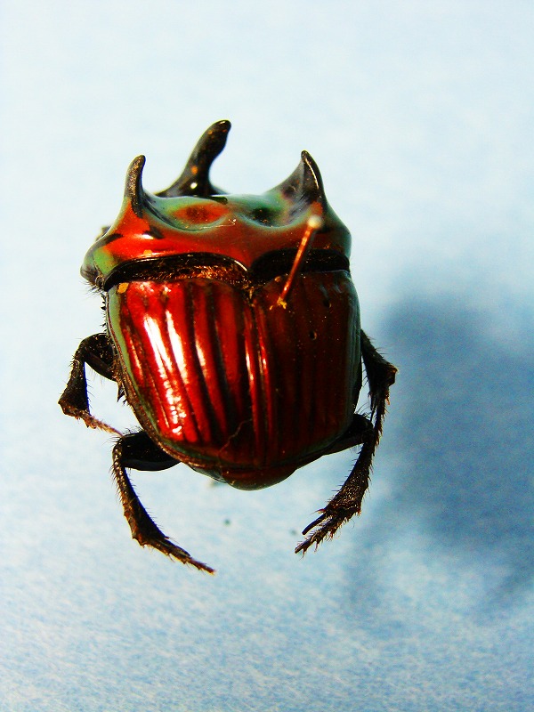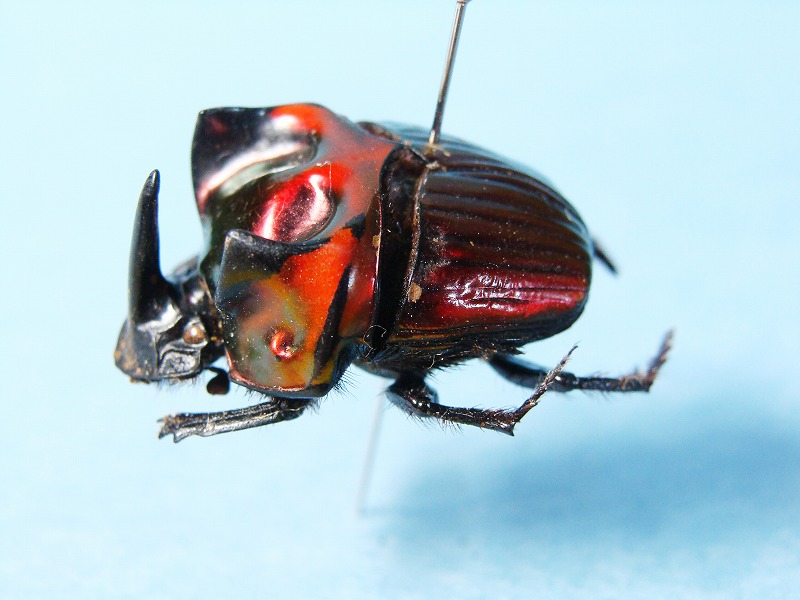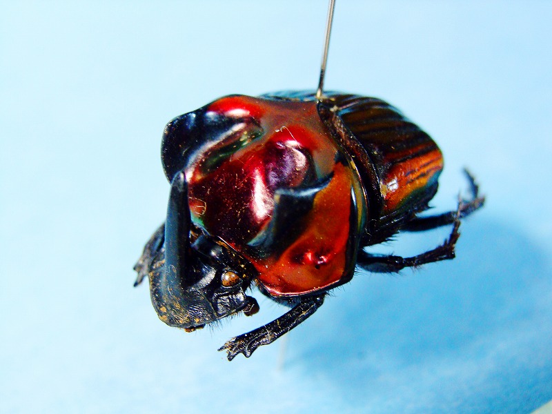 おつぎは、フェスティブゥムニジダイコク 学名 : Oxysternon (Oxysternon) festivum festivum Linnaeus こちらも南米、仏領ガイアナとか詳しくはは分かりませんが。 赤系のメタリックで、側面がすこし緑系に変化してゆく玉虫色の構造色、クレージーというか非常に美麗なカラーリングです。