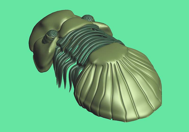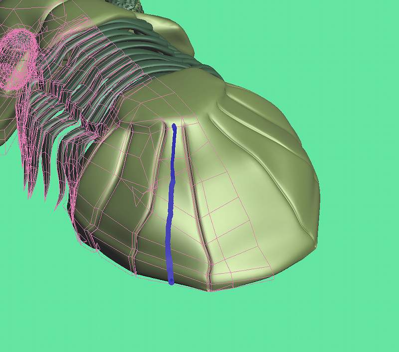 製作途中の三葉虫のお尻で解説します。 下の左側の図の青い線のところにスジ彫りをとおしてみたいとおもいます。