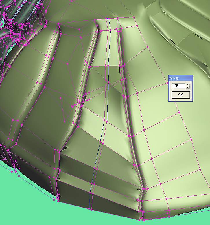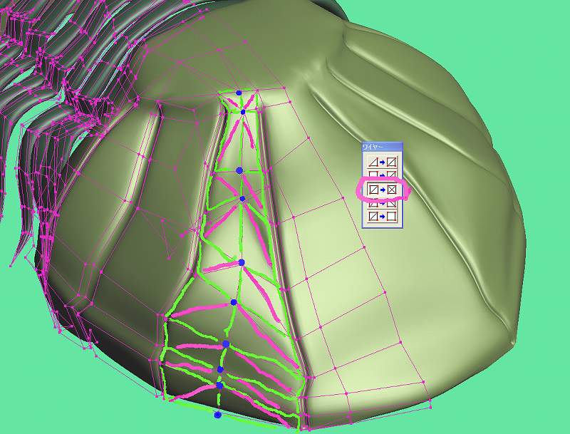 辺と辺の間にワイヤーツール(W)の真ん中、「辺と辺の間に頂点を追加」でラインにそって点を打ってゆきます。 そうすると、余計な辺もできてしまい、緑の四角ポリゴンのなかにピンクの太線で描いたような辺もできてしまうので、これはワイヤーツールの一番下の「三角面を四角に・・・」で消してしまいます。