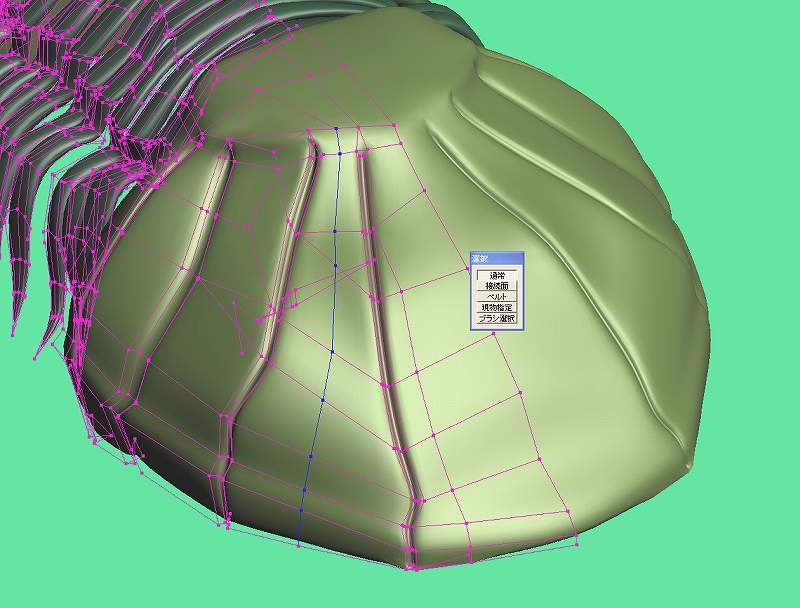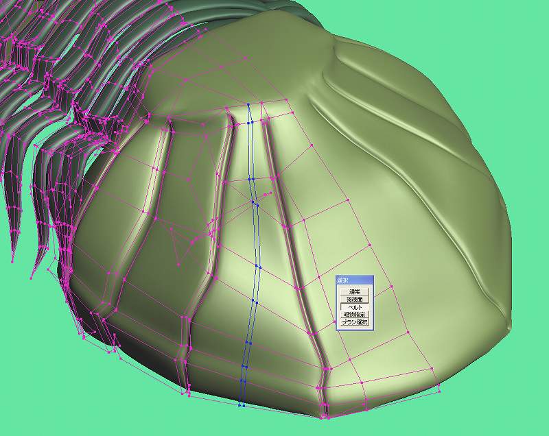 そのあと、新しく作った辺をMASHさんのプラグイン「連続辺を連続選択」(http://www.asahi-net.or.jp/~jv9h-msk/metaseq/index.html)で選択、ひとつ、ひとつ選択して行っても良いのですが、こちらのほうがだんぜんべんりです。