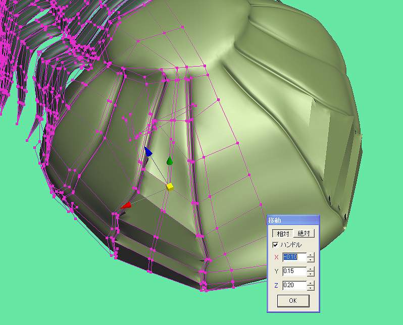 こうして幅はつきましたが、頂点の位置が微妙にずれてしまい、辺と辺の間がはなれて角ばった状態なのでそれを修正してゆきます。 オブジェクトの「近接する辺くっつける」で一括で行けるのでしょうが、そんなに面倒でもないし手でやる感覚が好きなので、移動ツール⇒左クリック頂点選択+右クリックで一つずつ頂点を繋げてゆき面をならしてゆきます。