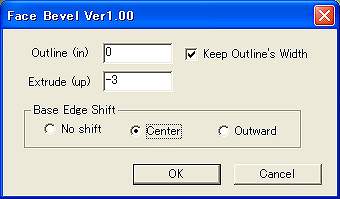 幅をつけたのが右、選択⇒ベルトで作った幅の付いた辺を選択して、選択部処理からプラグイン「Face Bevel」(今現在公開終了のようで、代わりにsig/relizeさんが現在Multi Bevelと言うプラグインを公開しているそうです。http://www1.ocn.ne.jp/~relize/)でラインに沿って-方向にぼこっとへこませる。