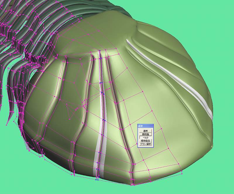 シロっぽく表示されたところがへこんだところの深さ、側面になります。 このままだと変なので、お尻のパーツを全部選択し、選択部処理⇒面に現在の材質を指定で白いところもすべてもとの色の表示にしてやります。