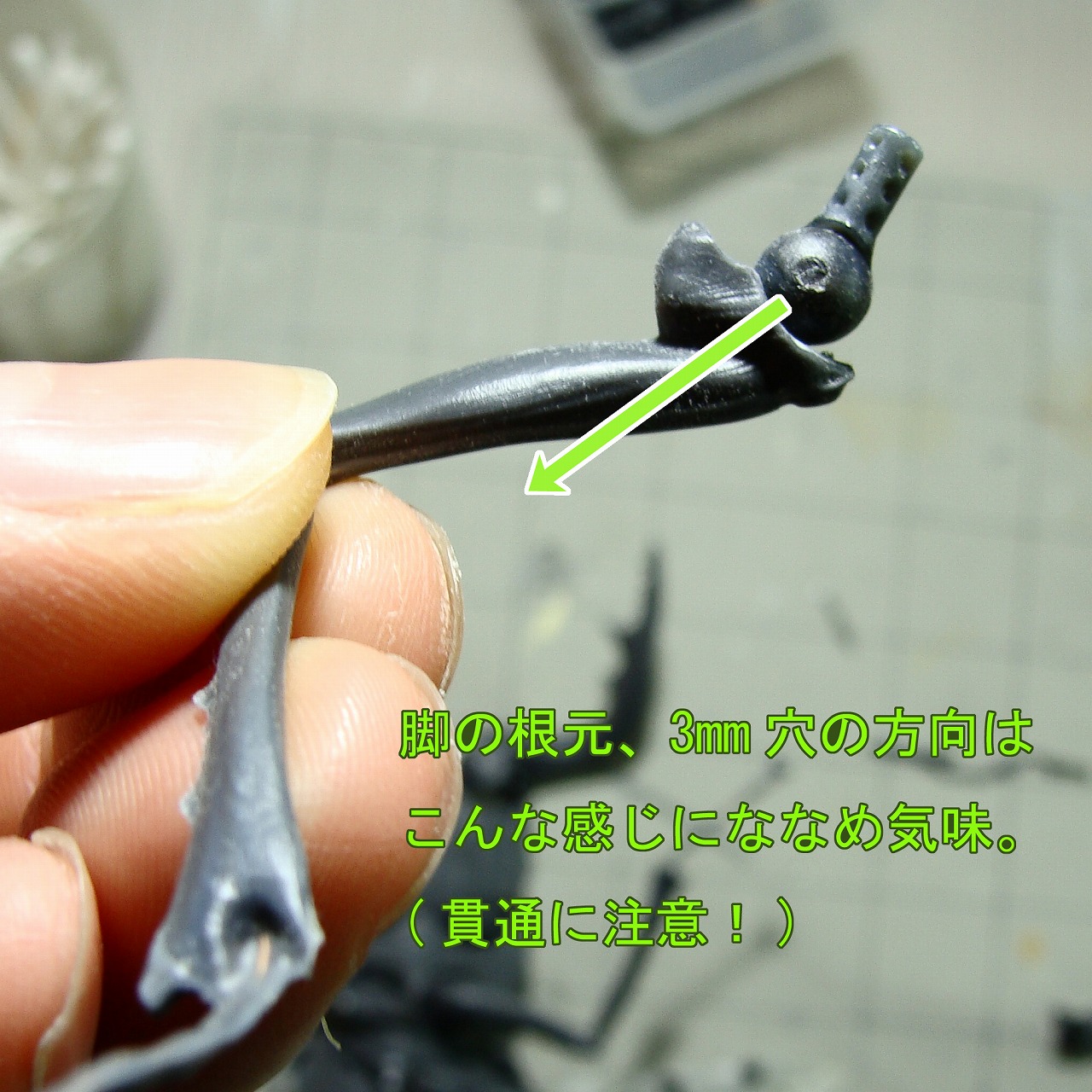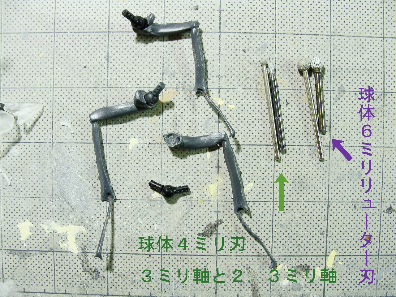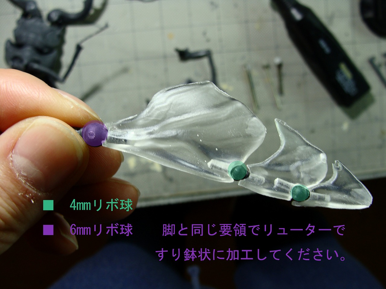 8ミリリボ玉、6ミリリボ玉の穴には6ミリ球ぐらいのリューター刃を、羽の可動箇所の4ミリリボ玉を収める穴には4ミリ刃かもう少し小さいものなどを使ってください。