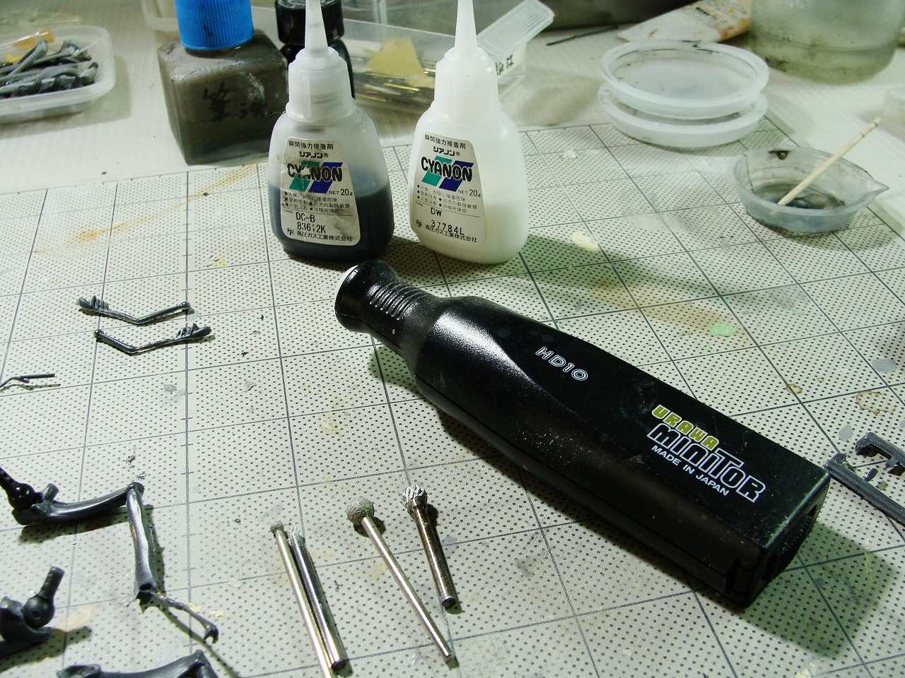 ガレージキットを作るうえで、リューターとシアノン(瞬間接着剤、硬化剤と併用でパテとしても簡単な穴埋めに使える)は持っておくのをお勧めします。 リューターは100均などで¥1.000位から買えます、刃も一本¥200前後からホームセンターで売っていますので、バリ取りや磨きにとても重宝します。