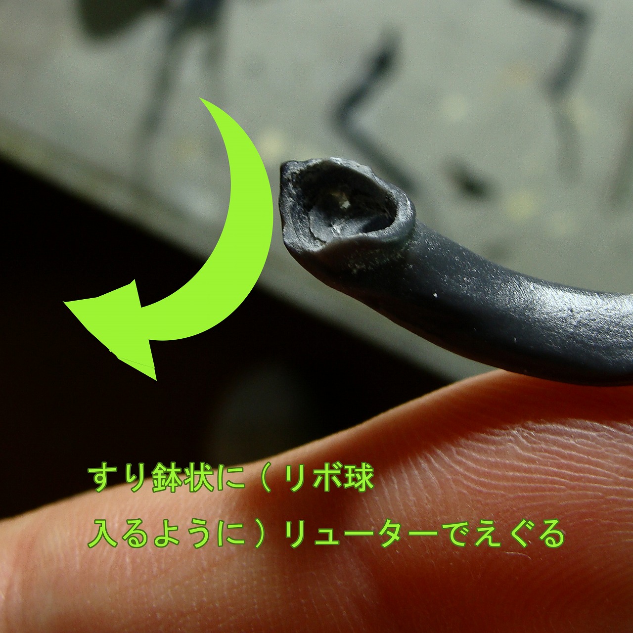 リボジョイントが収まる穴をリューターですり鉢状にえぐり、さらに軸を収める3mm(2mm)