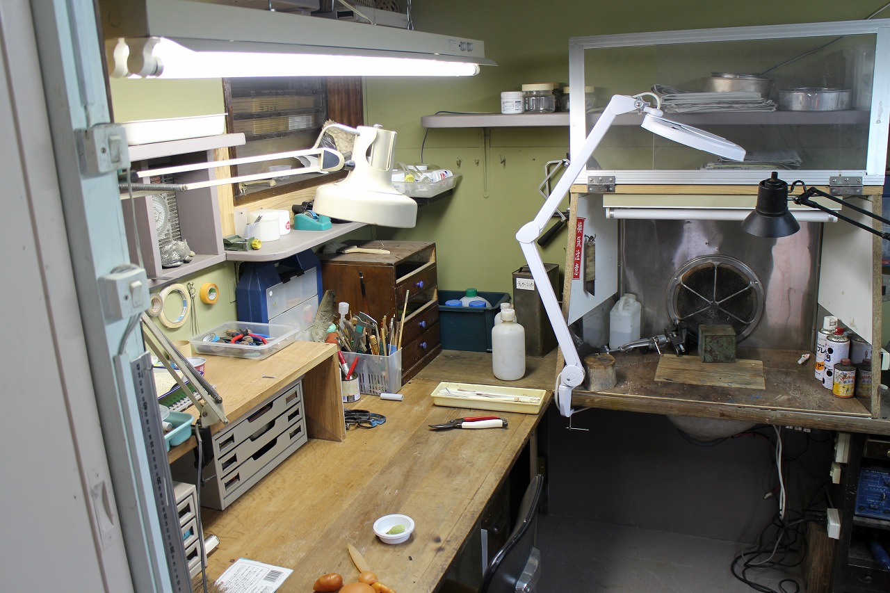 模型の作業机とCG制作のPC周り。 随所に工夫されていてきれいです。