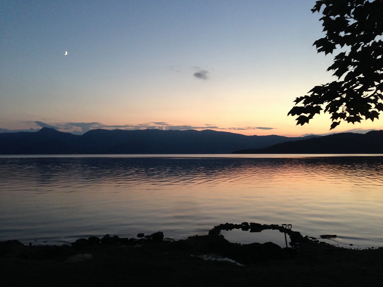 遠くに月がでて、湖面も風がなくとても穏やかでした。