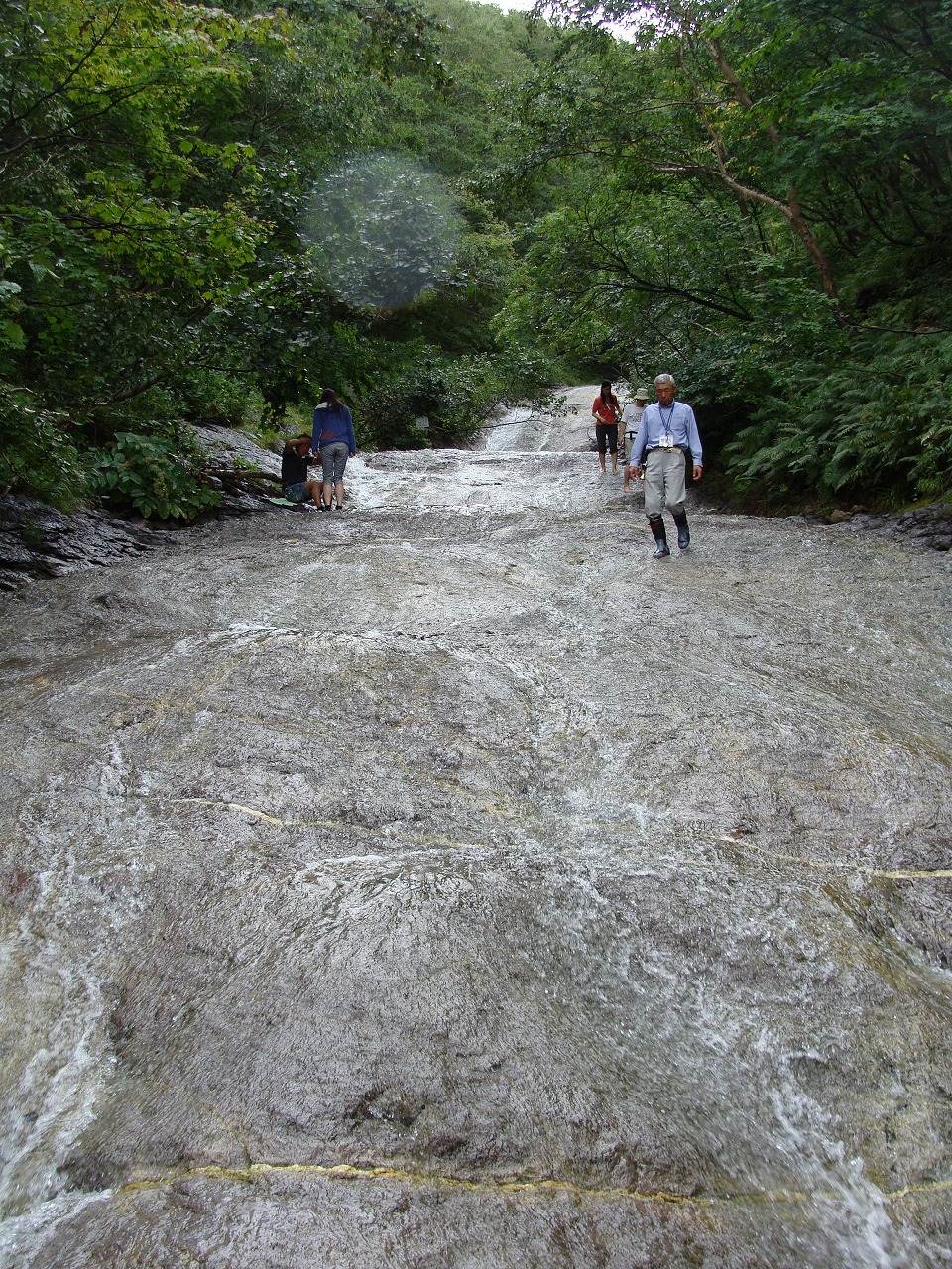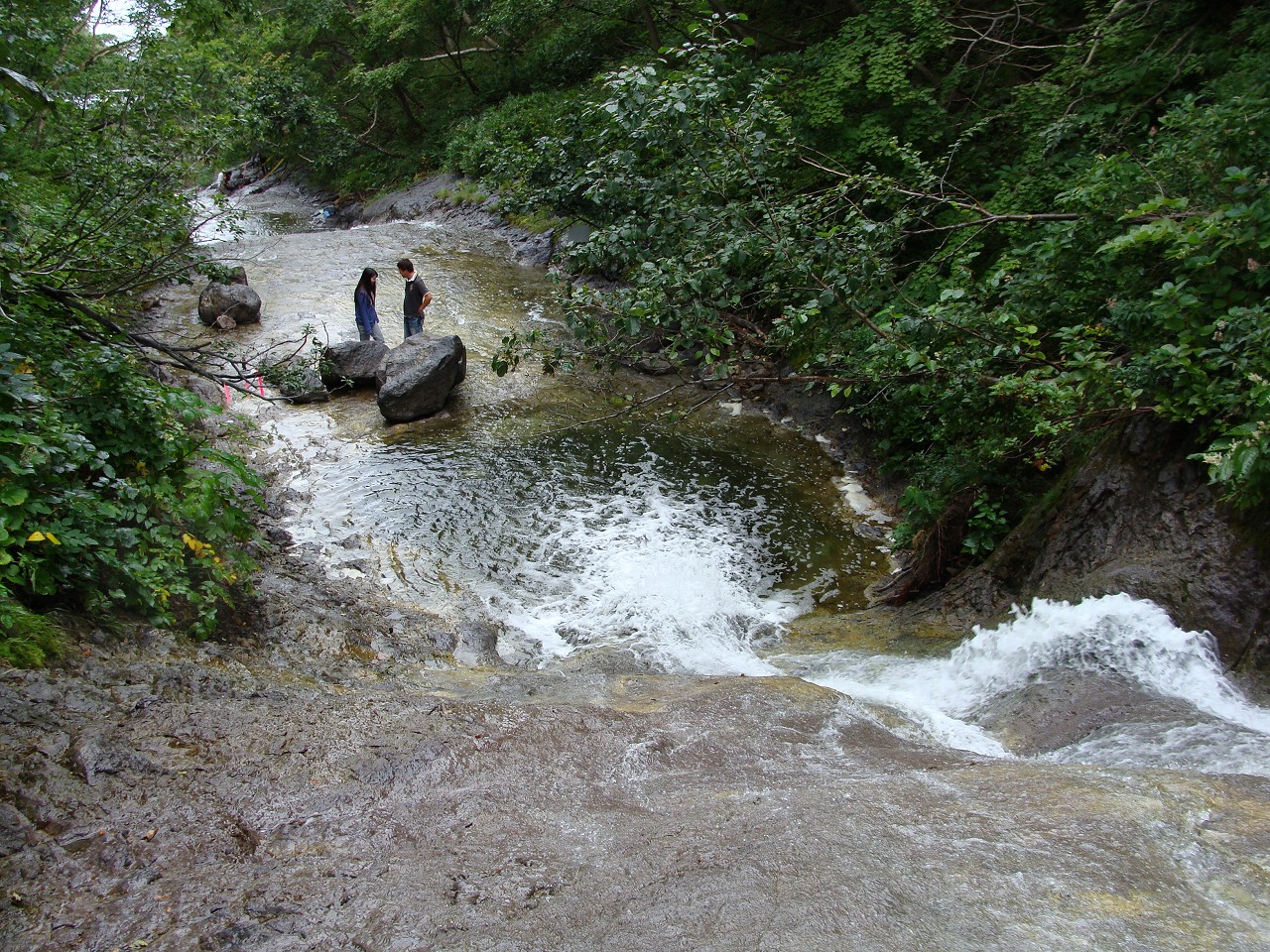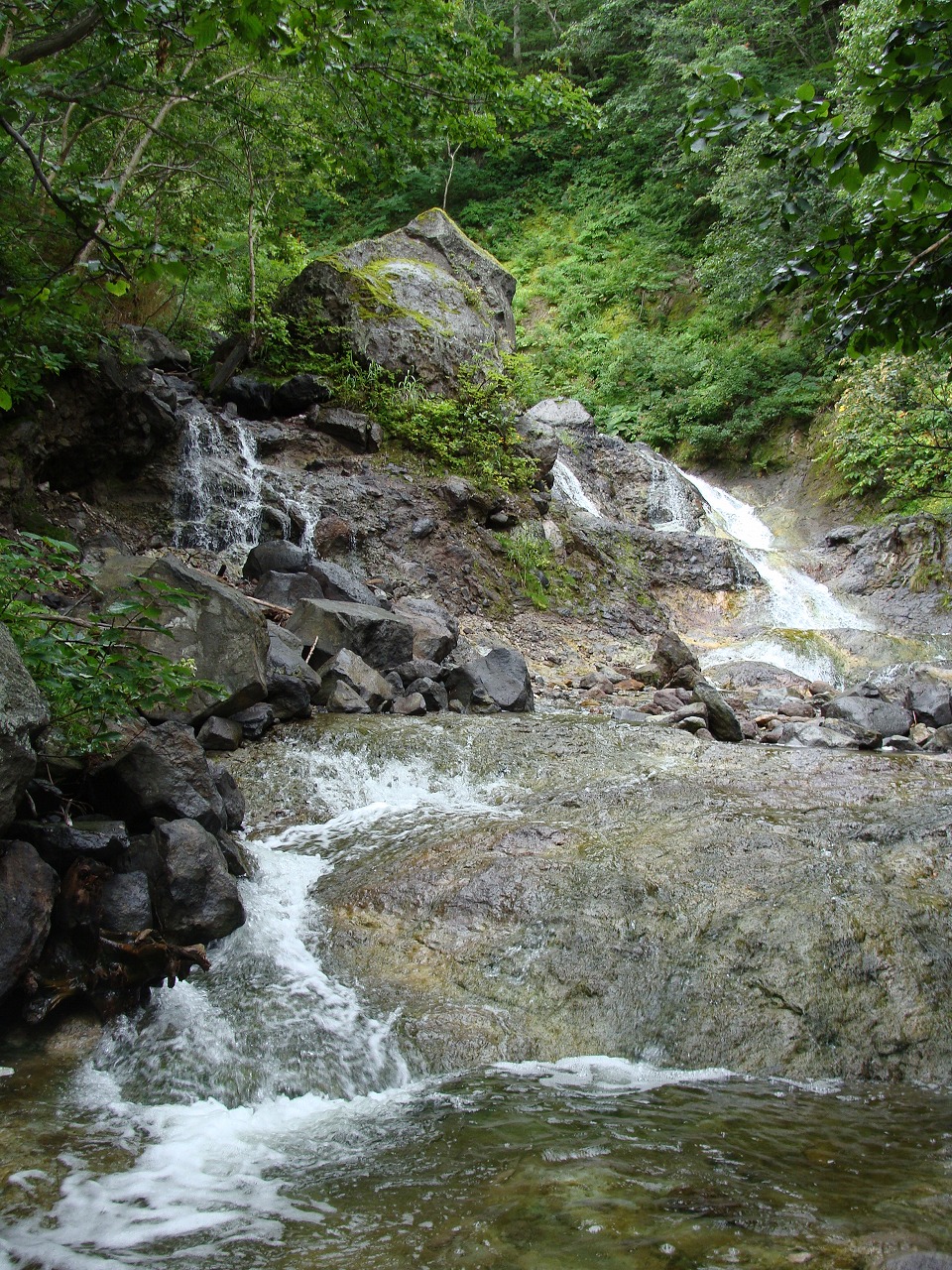 ウトロから知床5湖を超えて更に奥へ、ウトロ側の車で行ける一番奥にあるカムイワッカの滝、若干雨のためかぬるめでしたが、川の水が温泉になっています。