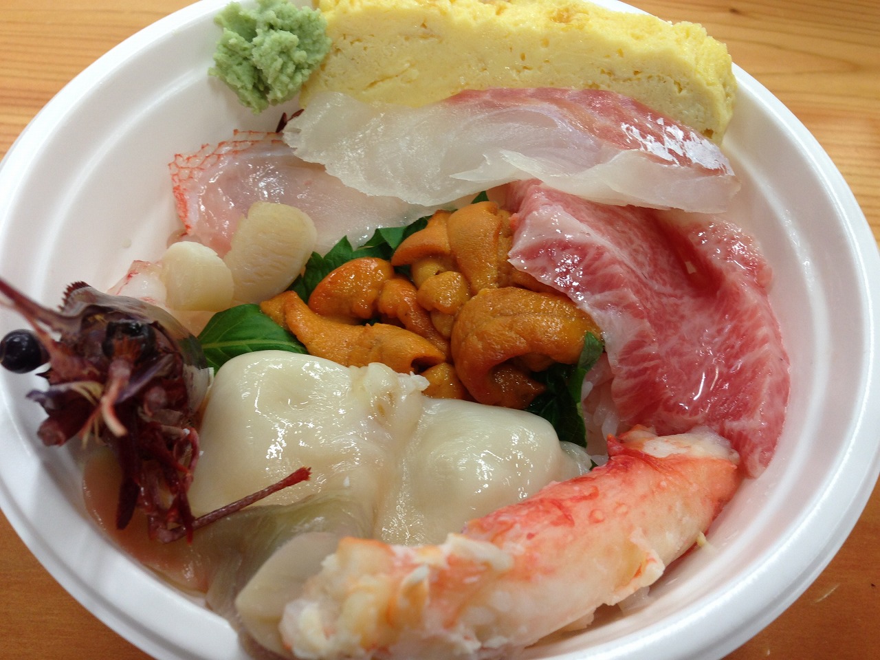 北海道といえば魚介類! あちこちの市場でやられているようですが、今回立ち寄った釧路市の市場でも、勝手丼というご飯を買って好きな具材をいろいろなお店を巡って乗っけて食べさせるのをやっていました。