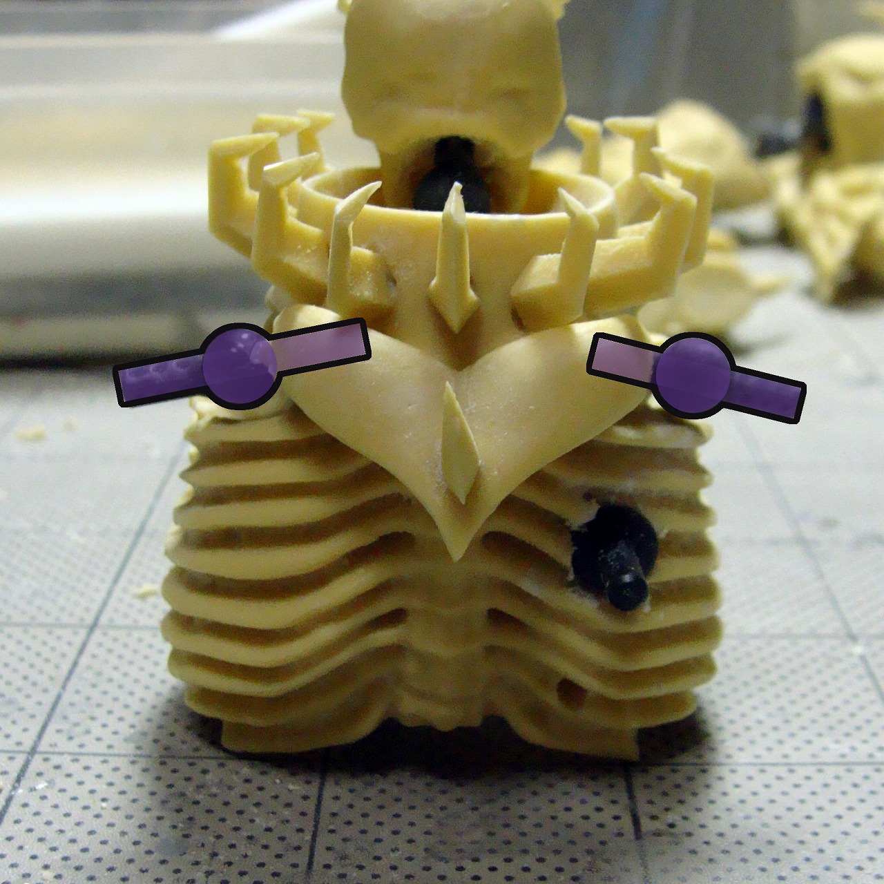 肩の装甲と胴をつなぐリボジョイント(6mm)の取り付け位置はこんな感じです。 リボジョイントは胴体のほうに固定してください。