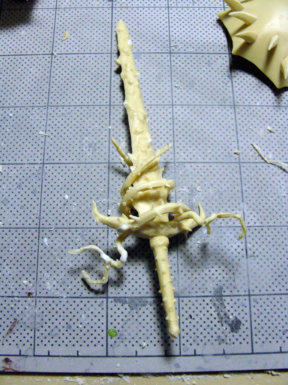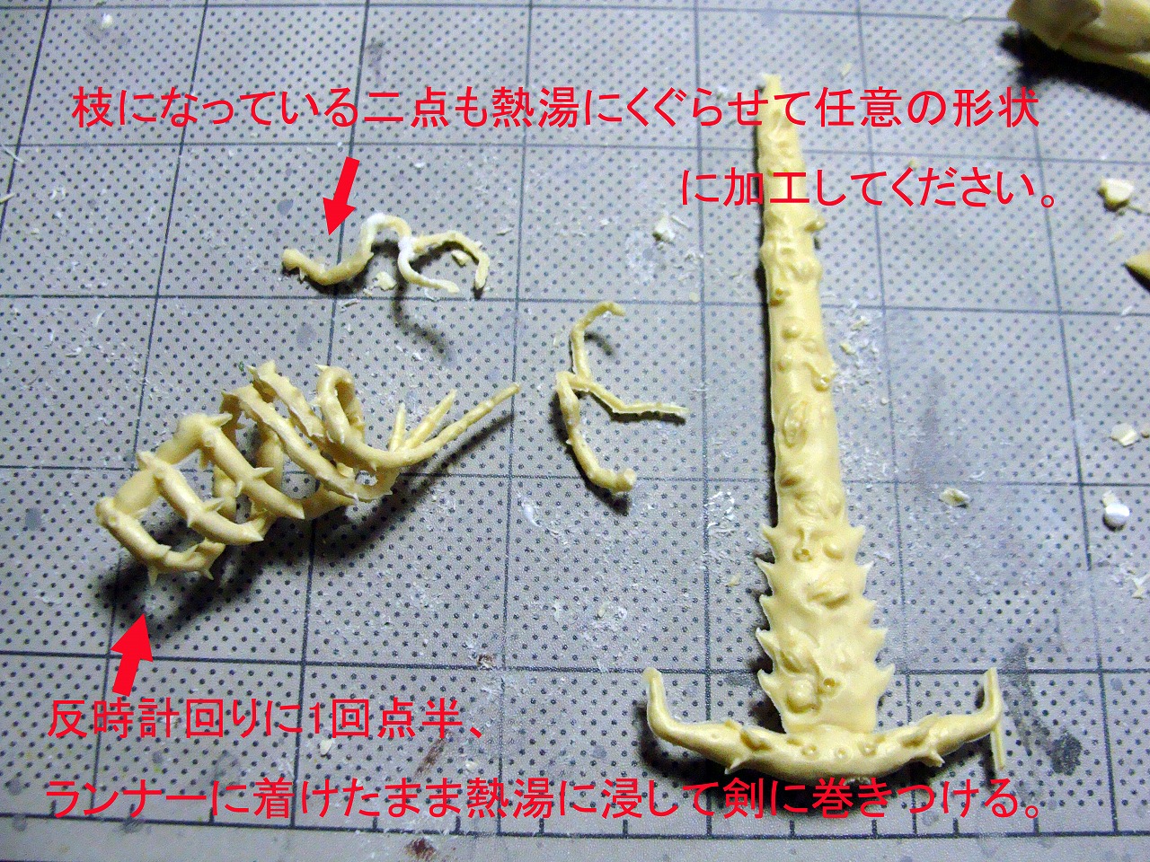 長い方の蔓のパーツは2本使いまして、1本は予備です。 ランナーに着けたまま同時に加工すると楽です。 剣の下から上に昇るように反時計回りに絡み付いてゆきます。(方向に注意!)